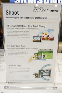 展示ではGALAXY Cameraの魅力を“Shoot”と“Share”の2つに分け、“Shoot”では、撮影した写真を大画面で楽しめる点や、ピンチイン/アウトでズーミングできる点、画面を数タップするだけで撮りたい写真に最適な設定を選べる「スマート プロ モード」の搭載をアピール。“Shere”では撮影した写真をいつでもSNSなどにアップロードできる点、Wi-Fiダイレクト機能を使って最大8台までの対応端末と撮影画像をシェアできる点などがアピールされた。なお、ブーススタッフの説明では日本での展開は未定とのこと。
