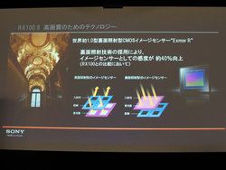また、F1.8のカールツァイスレンズと画像処理エンジン“BIONZ”との組み合わせで、低ノイズ性能にも配慮。RX100に比べて約1段分のノイズ改善を実現させたという。