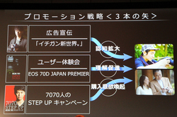 EOS 70Dはコミュニケーションパートナーに妻夫木聡さんを採用。「イチガン新世界。」というキャッチフレーズを設け、テレビCMなどでアピールする。CM撮影はスコットランドで行われたとのこと。EOSを使い、上田義彦氏が撮影を担当した。