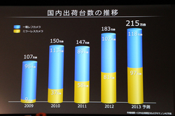 一眼レフ/ミラーレス一眼カメラの国内出荷台数は近年右肩上がりで伸びており、2013年は215万台にまで達すると予測されている。内訳としてはやはりミラーレス一眼の伸び率が高いが、デジタル一眼レフも順調に成長してきており、今年の出荷台数は約118万台になると見られている。