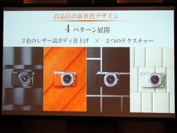 「我々は世界初のミラーレス一眼を開発したメーカー。写真文化を創っていくメーカーだと自負している」とする北尾氏は、新製品についてまずデザイン性をアピール。4色それぞれに合わせてテクスチャーを変えて各色が特徴のある存在感を持てるようにしたこと、3連ダイヤルにローレット加工やダイヤカットを施して高級感のある仕上げにしていること、レンズや別売のハンドグリップにもダイヤカットを施していることなど、高品位を意識したデザインを採用したと語る。