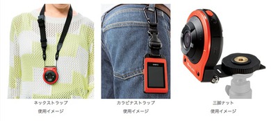 コントローラーから分離したカメラ部は、付属のヒンジユニットをスタンドとして使うことができる。また、カメラ部やコントローラーを首からぶら下げる「ネックストラップ」、コントローラーをぶら下げるための「カラビナストラップ」、市販の三脚ネジに取り付けるための「三脚ナット」と、3種類の脱着可能なアタッチメントも同梱している。