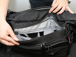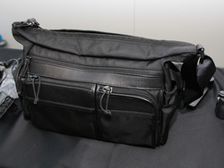 α7シリーズと小三元レンズの収納に最適化したというキャリングケース。本体素材には本革とナイロンを採用している。収納性能としては、SEL2470Zを装着したα7シリーズ+スペアレンズ1〜2本、(SEL1635Z,SEL70200Gなど)+タブレット、アクセサリー等を収納できる。