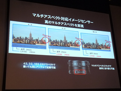 本機はレンズのイメージサークルより大きいセンサーを使用することで、16:9、3:2、4:3のいずれの横縦比でも同じ画角、さらに1:1の横縦比でも撮影できる「マルチアスペクト」に対応している。