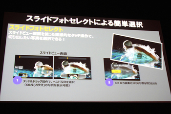写真を選び出す再生画面は、スライドフォトセレクトで写真を1枚1枚確認しながらタッチ操作で選ぶことが可能となっている。