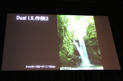 Dual I.S.の効果は、暗い場所や意図的にシャッター速度を遅くして手持ち撮影を行った場合でもブレない程だと説明し、作例を示していた。