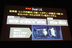 最高画質の性能を支える機能として、レンズ内手ブレ補正2軸とボディ内手ブレ補正4軸を組み合わせた6コントロールによる新たな手ブレ補正機能「Dual I.S.」を搭載。Dual I.S.を搭載するのは、レンズ交換式デジタルカメラとして世界初で、従来比で最大3.5倍の補正角拡大だという。