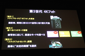 新たな撮影スタイルである、秒間30コマを連写し、撮影後に好きなコマを選び出す「4Kフォト」機能も搭載。撮影時、瞬時に秒30コマ連写に切り替えを可能とするためドライブモードに4Kフォトを追加するなど、同社は本機の4Kフォト機能を第3世代4Kフォトとしている。