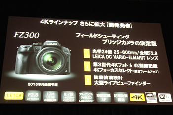 さらに、フィールドシューティングブリッジカメラの決定版としている「FZ300」を2015年中に発売することも発表した。レンズは、光学24倍の「LEICA DC VARIO-ELMARIT 25-600mm/F2.8」を搭載。第3世代4Kフォト機能や4K動画記録に対応。4Kフォーカスセレクトにもファームアップにより対応する。