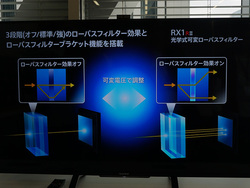 世界初の光学式可変ローパスフィルターを搭載し、一台でローパスフィルター効果のオン/オフを実現。被写体やシーンに合わせて、ローパスフィルターレス同様に解像感を優先する「切」、解像感とモアレ・偽色のバランスを優先する「標準」、モアレ・偽色を低減する「強」の3段階から選択できる。ローパスフィルターブラケットも搭載しており、1回のシャッターで3段階の効果を同時に撮影することも可能。