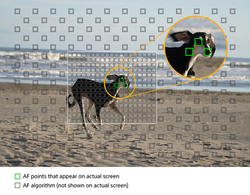 加えて、“高密度AF追従テクノロジー”も新開発。被写体の位置に対して、α6000の約7.5倍の密度となる200点以上の測距点でAF枠を集中配置し、さらにこの集中枠を被写体に合わせて動的に動かすことによって、高い追従性能を実現したという。