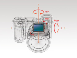 望遠レンズ装着時に起こりやすい角度ブレ(ピッチ/ヨー)、マクロ撮影時など撮影倍率が大きくなるに従い顕著に現れるシフトブレ(X軸/Y軸)、手持ちでの動画撮影時などに目立つ回転ブレ(ロール)など、様々なブレに対して5軸で検出して補正。新開発の高精度ジャイロセンサーを搭載し、5.0段の補正効果を発揮、さらに動画撮影時でも5軸で手ブレを補正するため、静止画と動画共に高精度の手ブレ補正が可能だとしている。