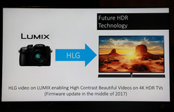 アナウンスされたのは、LUMIXでHDR動画の撮影が可能になる、ということ。HDRの方式はHybrid Log Gamma(HLG)で、2017年中頃のファームウェアアップデートで対応するという。