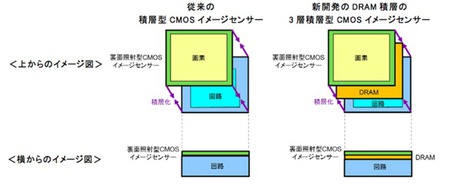 従来の積層型CMOSイメージセンサーは、画素部分と、画素部分から読み出したアナログ映像信号をデジタル信号へ変換する回路の2層構造だった。今回開発された新イメージセンサーは、その間に大容量(1Gbit)のDRAMを挟んだ3層構造にした。これは業界初で、各層に搭載された回路間のノイズ低減などの問題も克服しているという。