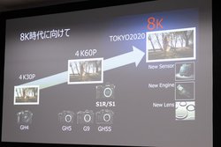 また今後の方針として、従来のマイクロフォーサーズ機を機動性・高速性を活かした「Gシリーズ」とし、Sシリーズはフルサイズセンサーで究極の高画質と表現力を追求するモデルといった、各フォーマットの強みを活かした2つのシリーズで展開していくことも説明。さらに2020年の東京オリンピックに向けて、8K撮影について開発中であることを明かした。現在、新センサー・新エンジン・新レンズを開発中だという。
