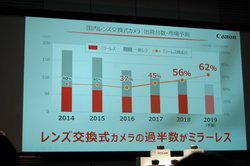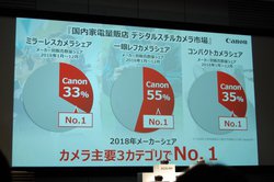 2018年にキヤノンは「ミラーレスカメラ」「一眼レフカメラ」「コンパクトカメラ」の主要3カテゴリーで販売シェア1位を獲得。「特にミラーレスでは2012年の市場参入以来初のトップシェアとなり、対前年比140%と大きく伸ばすことができた。今後も新たなユーザー層を獲得するべく取り組んでいく」。