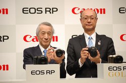 キヤノンは本日、「キヤノン デジタルカメラ新製品発表会」を開催。「EOS Rシステム」のフルサイズミラーレスカメラ第2弾として、小型・軽量化を実現した新製品「EOS RP」を発表した(関連記事)。ここでは、発表会に登壇したキヤノン株式会社 執行役員 イメージコミュニケーション事業本部長・戸倉剛氏、キヤノンマーケティングジャパン株式会社 取締役 専務執行役員・松阪喜幸氏による新製品投入の狙い、および、国内市場のマーケティング戦略についてお届けする。