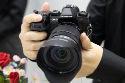 オリンパスでは、発売されたばかりの新機種である、最高7.5段の手ぶれ補正に対応したミラーレス一眼カメラ「E-M1X」(関連ニュース)のタッチ&トライコーナーを展開。