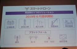 今後のサービス拡充では、「点検」では道路などへ対象を広げていくことができる。また、「ドローンを地域創成に対して活用していくことも検討している」と述べ、2019年度より長野県伊那市で実証実験をスタート。各産業や物流、災害や鳥獣害へ対応するインフラとしてスマートドローンの活用を目指す。「地域におけるさまざまな問題を、ドローンを活用して解決できないか。地方の活性化にも役立てていきたい」と力を込めた。