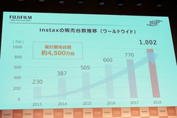 そして「イメージング事業は2018年度は2,575億円で、前年度を上回る成績だが、なかでもinstaxチェキはフォトイメージング事業全体を牽引している。今年はさらに売上を伸ばしていきたい」とチェキの好調をアピール。なお、チェキの2018年度の売上台数は1,002万台、累計売上台数は約4,500万台に及ぶ。