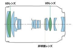 レンズ構成は15群21枚で、写真の色にじみを除去する「UDレンズ」や、非球面レンズも搭載。絞りは7枚羽の円形絞りで、F36までの最小絞りに対応する。また最短撮影距離は0.5mで、240mm時の最大撮影倍率は0.26倍。