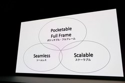 発表会では開発コンセプトについても詳しく説明された。現代のカメラ利用シーンを考えた場合に、「スマートフォン」「レンズ交換式カメラ」「シネマカメラ」の3つが挙げらると山木氏。スマートフォンは軽量でいつでも持ち歩けるため、日常の記録/コミュニケーションツールとして欠かせないが、「驚愕するような景色を残したいと考えた場合、十分とは言えない」とのこと。