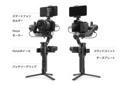 アクセサリーとして、カメラ上部やハンドル横にスマートフォンを取り付けられる「スマートフォンホルダー」、各種設定をジョイスティックで操作できる「コマンドユニット」、フォーカス制御が行える「Focus ホイール」、Focus ホイールと連動してカメラのフォーカスを制御する「Focus モーター」、取り付けネジ穴を拡張できる「チーズプレート」が用意。Focus ホイール/モーターなどがセットになった「Ronin-SC Proコンボ」も販売され、こちらは直販価格62,100円(税込)。