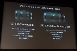 α6600/α6100と同時に、同社の高画質レンズ“Gレンズ” シリーズの新製品として、APS-C用大口径標準ズームレンズ“SEL1655G” 「E 16-55mm F2.8G」、超望遠ズームレンズ“SEL70350G” 「E 70-350mm F4.5-6.3 G OSS」も発表された。価格はSEL1655Gが153,000円(税抜)、SEL70350Gが109,000円(税抜)。どちらも10月25日より発売する。