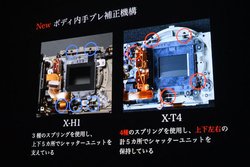 5軸の手ブレ補正となっており、補正効果は最大6.5段。これはX-H1よりも約1 - 1.5段ほど補正効果が高いとのことで、8倍の精度をもつジャイロセンサーを搭載することで実現したとのこと。細かな構造については、X-H1のあとにリリースした中判モデル「GFX100」の技術も活用したと、上野氏は説明する。