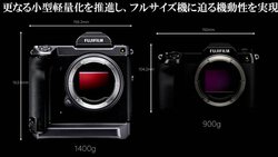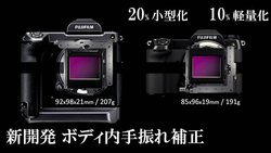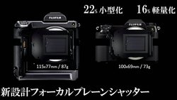 ボディの大きさはGFXシリーズ最小となり、外形寸法は150W×104H×44Dmm、質量は900g。2019年5月発売の1億画素機「GFX100」と比較すると、30%の小型化と500gの軽量化が行われている。軽量化のため、ボディ内手ブレ補正は20%小型化/10%軽量化を実施。フォーカルプレーンシャッターも22%小型化/16%軽量したほか、バッテリーには最新の「NP-W235」を採用することで軽量化を実現した。