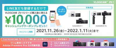 ソニーは、Vlog撮影用カメラ「VLOGCAM ZV-1」シリーズを購入すると、10,000円のキャッシュバッククーポンがもらえるキャンペーンを実施する。購入期間は2021年11月26日から2022年1月11日まで。