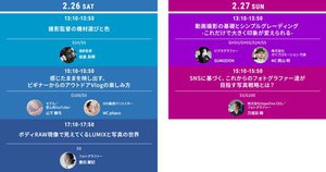 セミナーステージでは、LUMIXの画作りをテーマに4日間で計12種類のセミナーを用意。新型コロナウイルス感染症拡大防止のため、すべて事前予約制となっている。予約はLUMIX BASE TOKYOの特設サイトから行うことができ、また来場できないユーザーを対象にライブ配信も予定する。