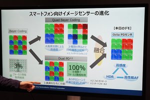 今回紹介された中でも、多くのユーザーにとって最も身近に感じられるであろう技術が、スマートフォン向け最新イメージセンサー。デモ展示が行われたのは、特に高感度かつ高画素を追求する大型センサー向けとなる「Octa PD」方式センサーで、HDR機能と高速オートフォーカス(AF)を同時に実現する。