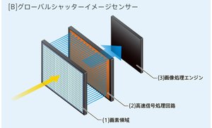 全画素を同時に露光・読み出しを行うグローバルシャッター方式を、レンズ交換式デジタルカメラとして世界初採用。従来用いられていたローリングシャッター方式が画像の撮像面上部の画素から順に読み出すのに対し、グローバルシャッター方式ではすべての画素を同時に読み出すため、高速で動く被写体を撮影する時でも歪みのない映像表現が可能になったと同社はアピールしている。