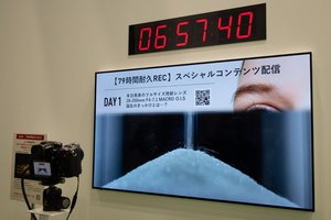 また、ブースの奥では同社ミラーレス一眼「GH6」を用いた「79時間耐久REC」を実施中。CP+開催期間中、79時間の連続記録(内部記録)を行い、その模様をYouTubeでライブ配信している。GH6は空冷ファンを搭載して無制限の記録を謳っていることもあり、79時間の連続撮影で止まることはないと、担当者は自信を見せていた。