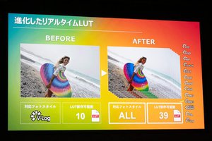 画作り機能として、撮影前に色味やコントラスト、彩度を好みに応じて調整できる「フォトスタイル」に加え、カメラ本体でLUT(ルックアップテーブル)を適用し、好みの色表現を撮影データに反映する「リアルタイムLUT」を搭載。モニター上部にはリアルタイムLUTの設定画面にワンタッチでアクセスできる専用ボタンも配置した。