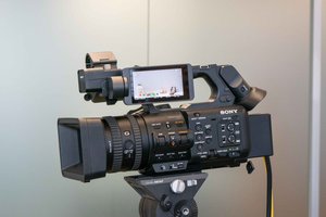 従来機から小型/軽量した点もアピールする。デモンストレーションでは、実際に新モデル群と販売完了モデル「HXR-NX5R」を持った際の重さの感覚を比較。「本体質量はさほど変わらないが、バッテリーを接続した際の重心の位置が、HXR-NX5Rはレンズ部が下に下がってしまうようになっているが、新モデルはバランスよく全体に重心くるため、実際に持ってみた印象は軽く感じる」と解説していた。