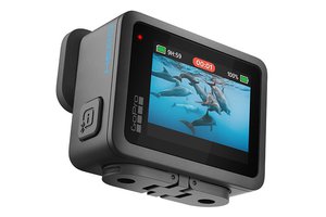 大型化/多機能化が進んだ従来モデルとは反対に、シンプルかつコンパクトを追求したとする4Kアクションカム。外形寸法は56.6W×47.7H×29.4Dmm、質量は86gとなっており、従来モデル「HERO12 Black」と比べて35%の小型化、44%の軽量化を実現した。