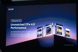 加えて、次世代のSD Expressカード規格「SD 8.0」に対応するモデルとして、「Lexar Professional GOLD PRO SDXC Express Card」もアナウンス。従来のSD 4.0(読み出し最大300MB/s)と比較して500倍の速度を実現したという。具体的なスペックは、最大1700MB/sの読み出し速度、最大1000MB/sの書き込み速度となっている。プレゼンでは1TBの容量が紹介された。