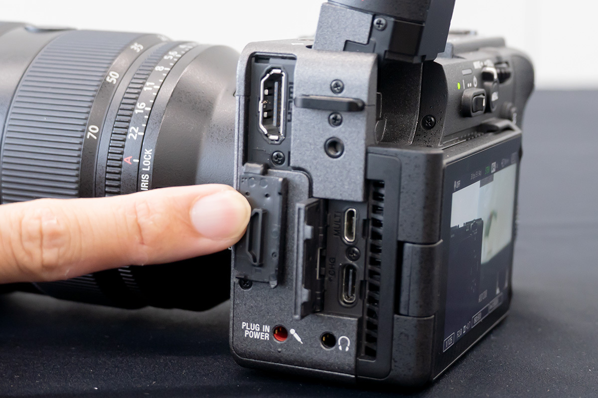 記録スロットはCFexpress Type AカードとSDメモリーカード(UHS-II対応)の両方に対応したデュアルスロットとなっている。インターフェイスには、音声入力端子/ヘッドホン端子として3.5mmステレオピンジャックをそれぞれ1系統備えるほか、USB Type-C(USB PD対応)×1、マルチ/マイクロUSB×1、16ビットRAW出力にも対応したHDMI Type-Aを1系統装備。Wi-Fi 5(IEEE 802.11ac)をサポートし、5GHz帯での伝送にも対応する。