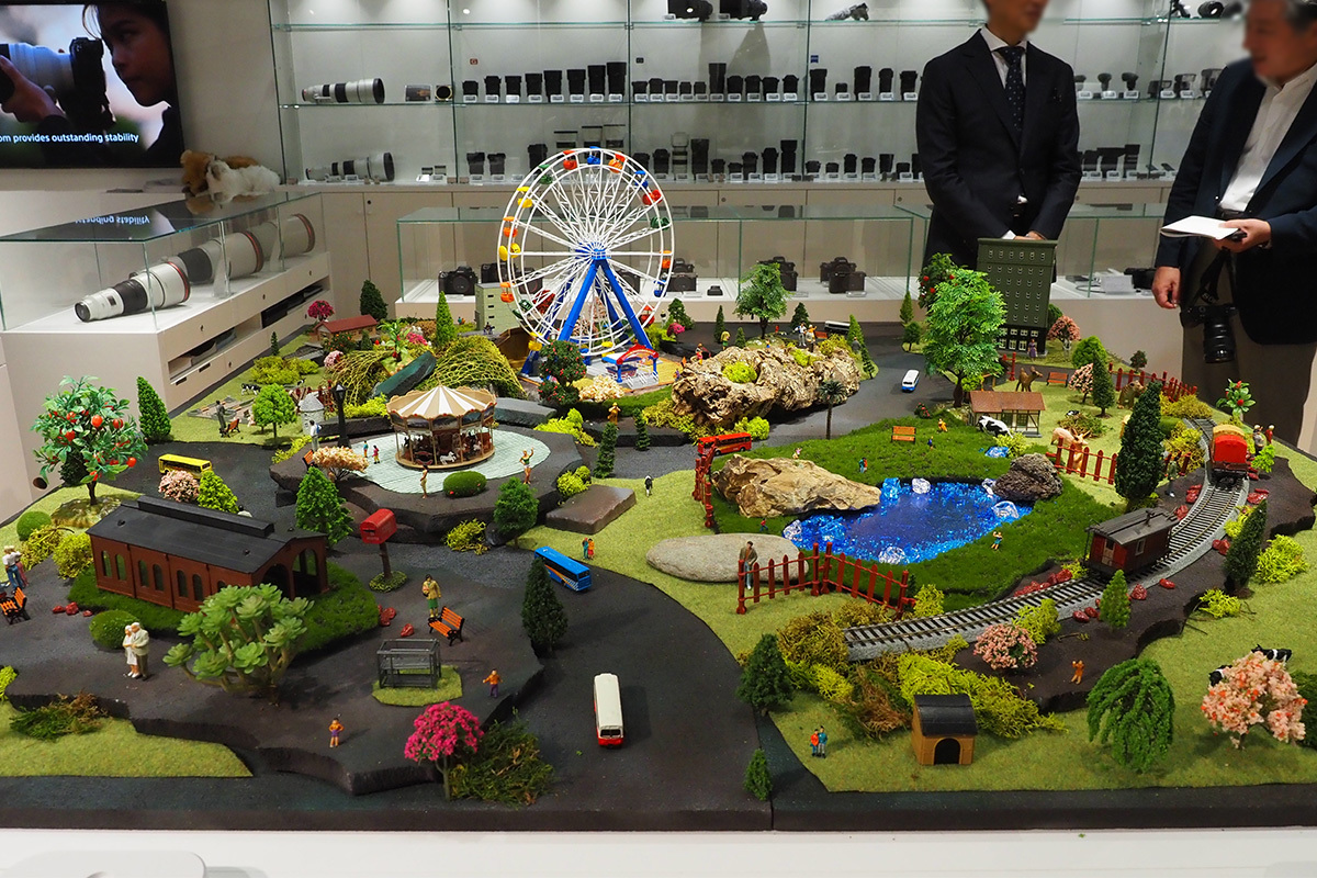 よりカメラの使用感がつかみやすくなるようにと、約1.5m角ほどの大きなジオラマを被写体コーナーとして新設。建物、人、動物などが配置されているのに加えて、くるくる回転するメリーゴーランドや観覧車も用意され、動きのある被写体の撮影を試すこともできる。