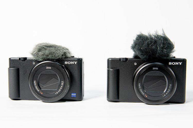 初代モデル「ZV-1」(写真左)との比較。搭載レンズを刷新したものの、大まかな形状に変更はない。天面部のボタンレイアウト、マイク構成の変化、ならびにウインドスクリーン素材が変更されている