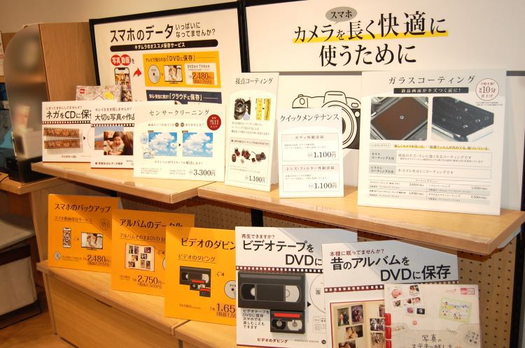 カメラ専門店ならではの最短当日仕上げの「カメラセンサークリーニング」、最短10分仕上げの「ガラスコーティング」などのサービスも充実する