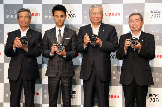 妻夫木さんとキヤノン首脳陣(左からキヤノン(株)真栄田雅也 常務取締役、キヤノンマーケティングジャパン 川崎正己社長、同取締役専務執行役員 佐々木統氏)
