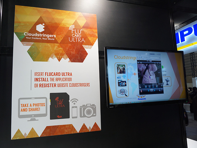 SDカードアソシエーションのブースには、Wi-Fi内蔵SDカード「FLU CARD ULTRA」の紹介も。撮影中の動画をストリーミングできる点が大きな特徴