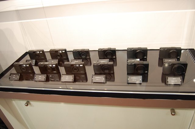 歴代のGRシリーズ。前列左端が96年10月発売の初代「GR1」。前列右端が来春発売予定の「GRIII」