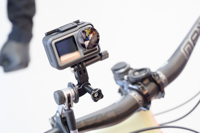 ハンドルに取り付けられたOSMO ACTION。レンズ部にはオークリーのプリズムレンズを装着