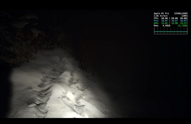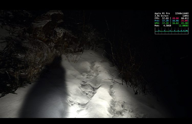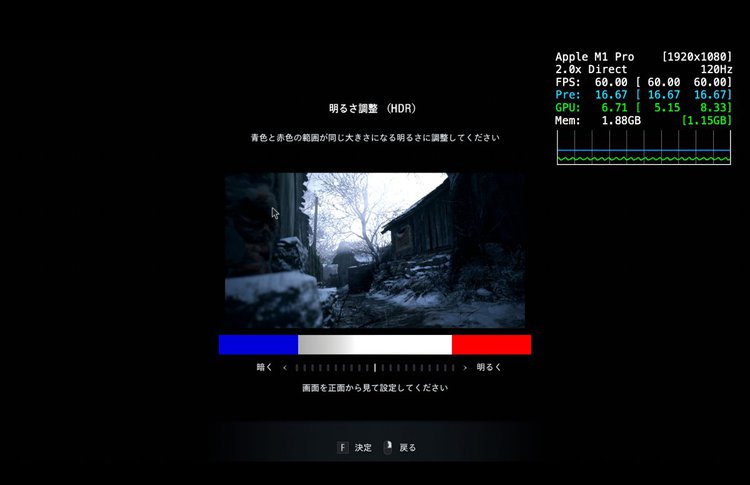 まず驚くのは「HDRのすごさ」だ。『バイオハザード ヴィレッジ』はHDRに対応している。そして、M1 Pro/Max搭載のMacBook ProはディスプレイがミニLED搭載液晶なので、ディスプレイがHDRに対応している。なので、『バイオハザード ヴィレッジ』のHDR出力を存分に楽しめる。