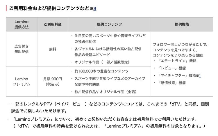 もっとも大きいのは利用料金の変化だろう。dTVは月額550円の定額制だったが、Leminoは基本サービスの場合は無料だ。最大18万本が視聴できる有料プラン「Leminoプレミアム」の場合、料金は月額980円になる。