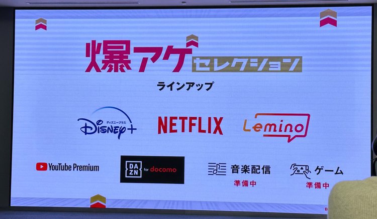 さらに言えば、ドコモは同時に「爆アゲセレクション」というサービスも始める。こちらはLeminoも含めた5つの映像配信について、ドコモの回線契約者にポイントバックするもの。例えばNetflixのプレミアムプラン(月額1980円)の契約者には360ポイント、Leminoプレミアム(990円)の場合で90ポイントが、毎月dポイントへと還元される。